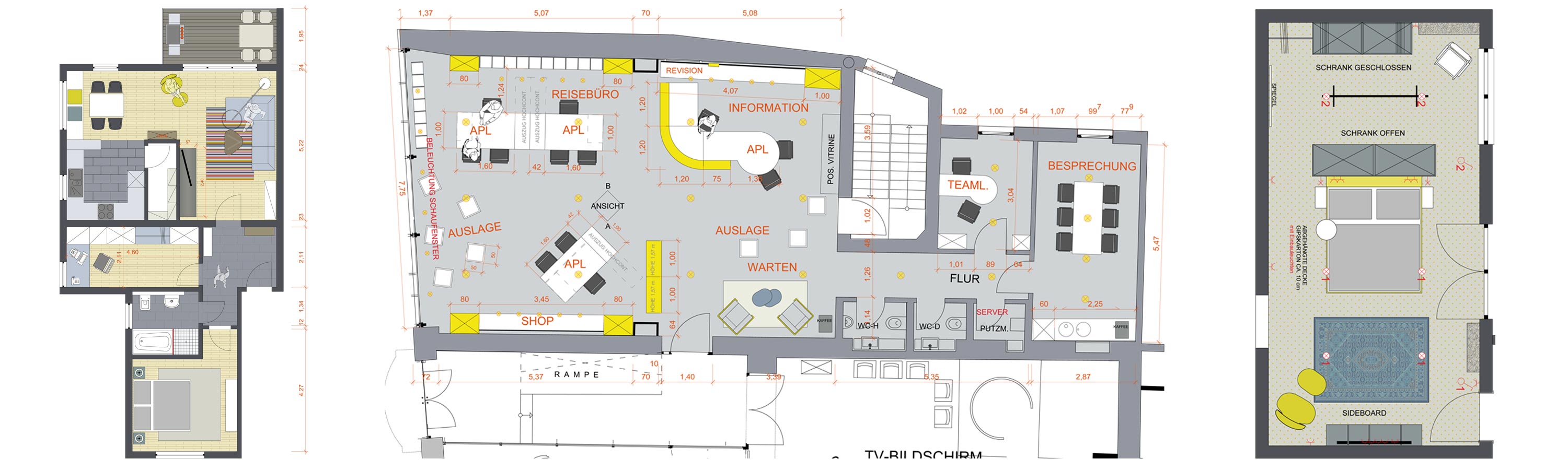 Entwurf mit entsprechender Darstellung in Grundriss, Ansichten und Perspektiven mit Farb- und Materialkonzept.